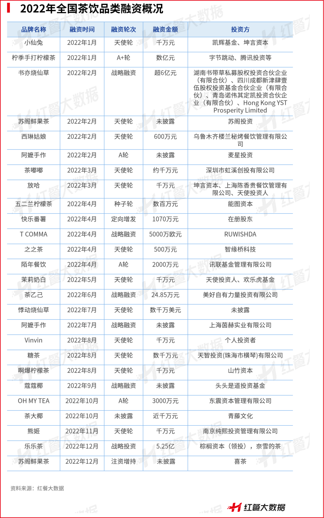 首先表现在资本层面,虽然2022年的融资事件数(26起)与2021年30起相差不大,但从融资金额与投资方实力等方面来看,资本对茶饮赛道的热情已开始降温,入局变得相对谨慎了。
