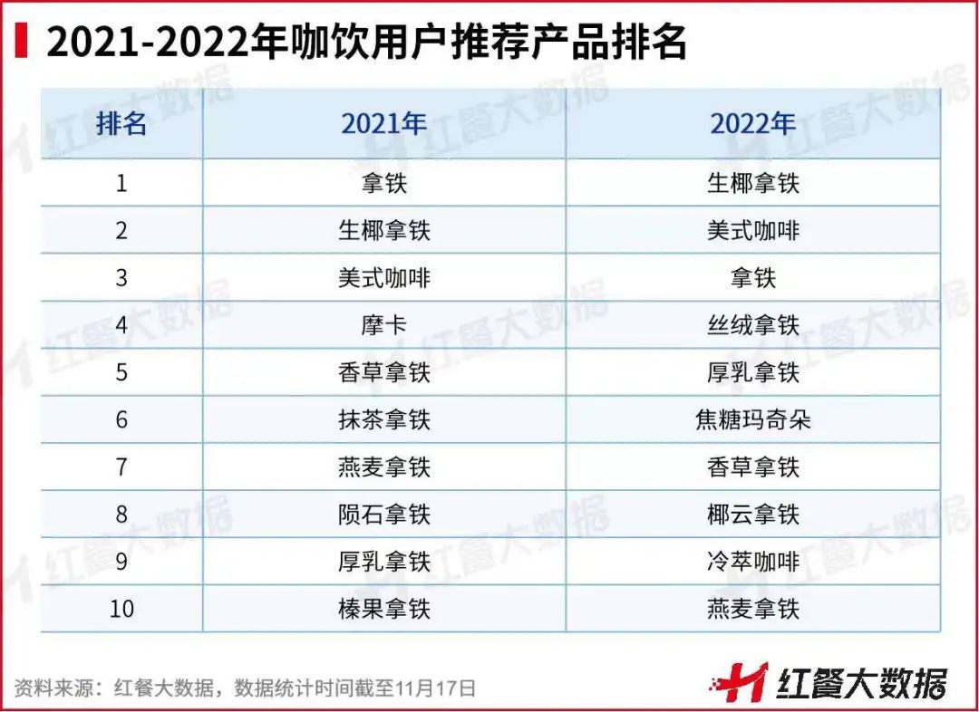 在产品上,口味越来越多元化,衍生出奶咖、果咖、茶咖以及各种特调咖饮产品。红餐大数据显示,在2021-2022年消费者推荐最多的10款咖饮产品中,拿铁类咖饮占据领先地位,其他经典口味产品譬如美式咖啡、摩卡等则排名靠后。