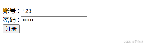 <!DOCTYPE html> <html lang="en"> <head> <meta charset="UTF-8"> <title>注册</title> </head> <body> <!--action="region"这个是对应web.xml--> <!--method="post"提交方式的说明,我们当时那里写的是dopost方法,所以这里使用post--> <form action="region" method="post"> 账号 : <input name="userid" type="text"><br> 密码 : <input name="userpaw" type="password"><br> <button type="submit">注册</button> </form> </body> </html>