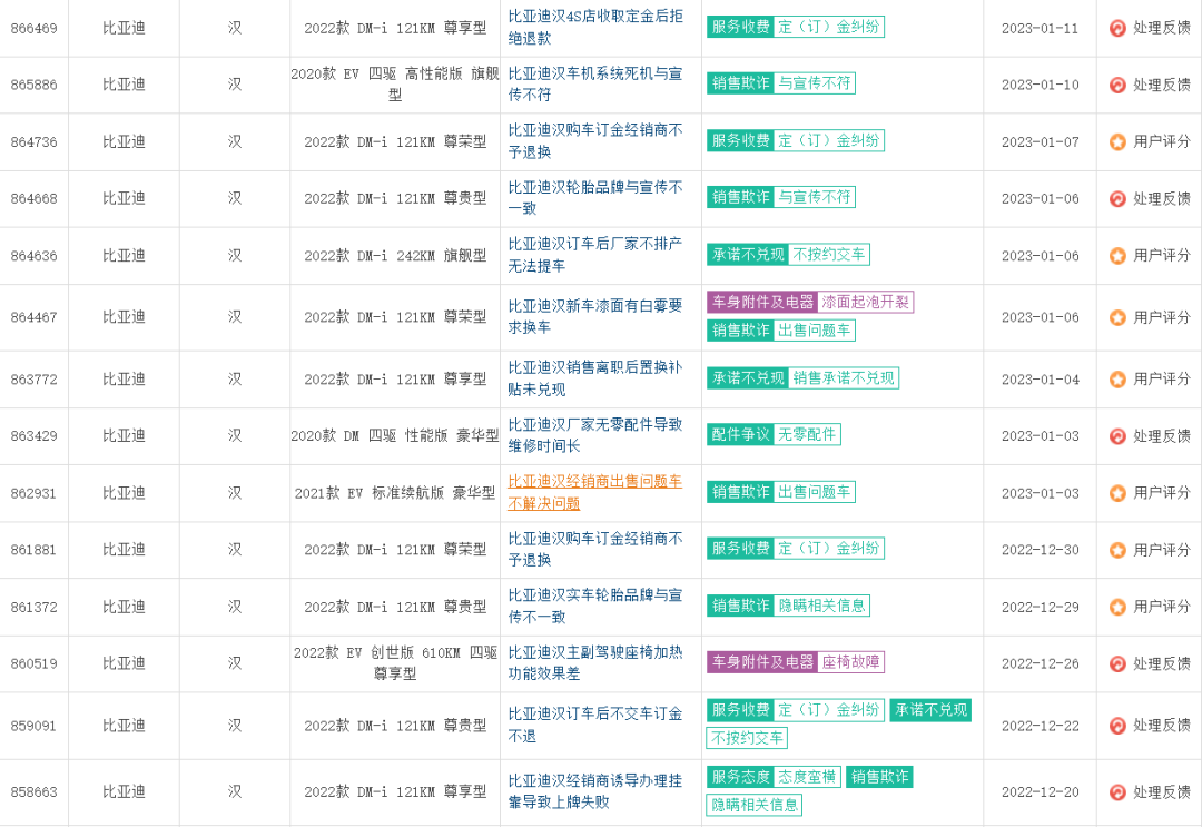 自比亚迪汉自2020年上市以来,可以看到消费者在车质网等第三方投入平台上的投入延续至今,投诉内容包括车身异响、车机系统卡顿黑屏以及自动驾驶功能失效等问题,以至于有消费者在网络上吐槽道“这些问题该是高端车型出现的吗?”