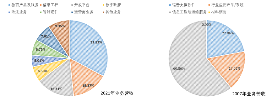 科大讯飞联合创始人胡郁曾经说过这样一句话,**“我们现在更多的是做产品、系统、服务、联合运营。”**如果结合科大讯飞的现阶段业务,你会发现,这家公司现在更看重教育产品销售和开放平台的运营。回顾2007年,科大讯飞行业应用产品的收入仅占总营收的17.02%,而现在它的主要营收重心已经向应用产品端发生偏移。