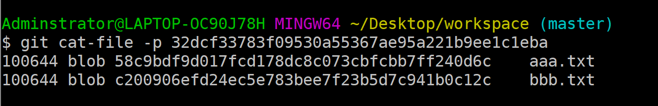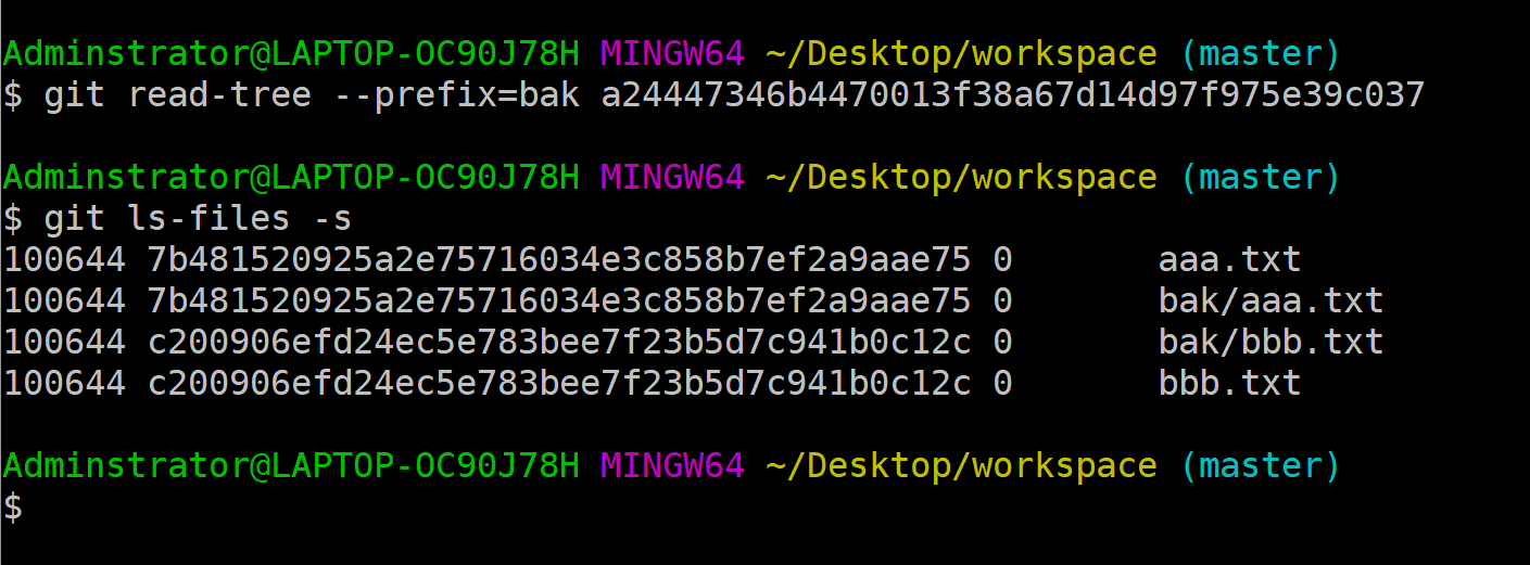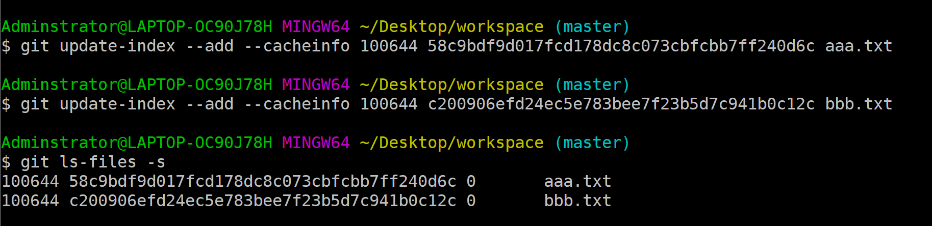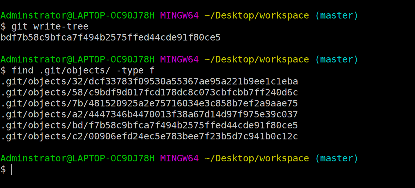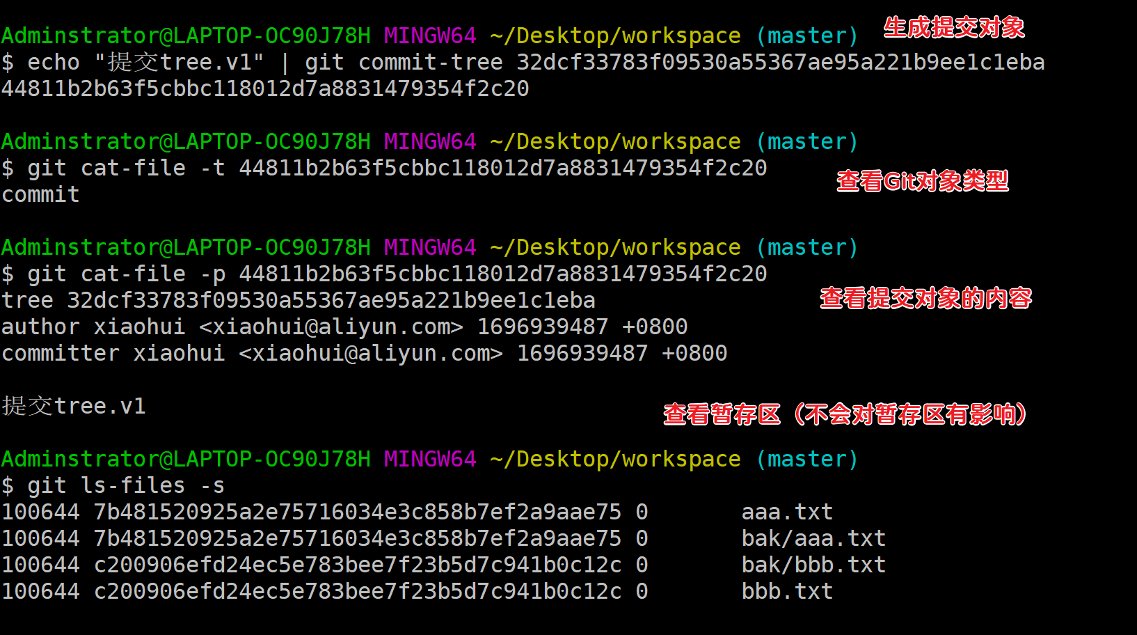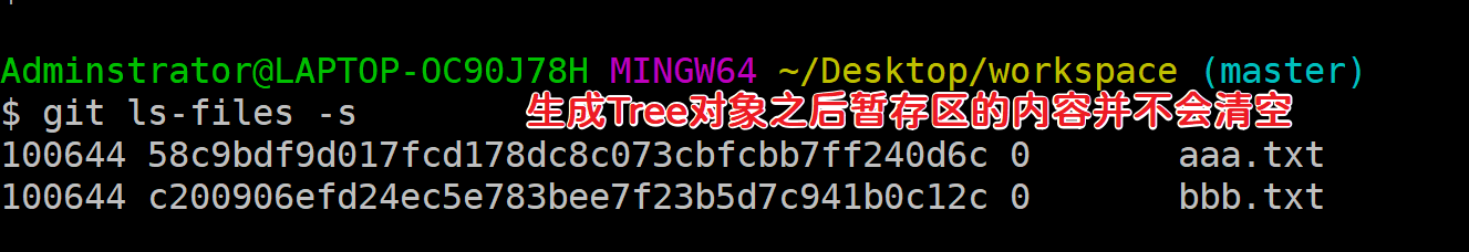 Adminstrator@LAPTOP-OC90J78H MINGW64 ~/Desktop/workspace (master)# 查看暂存区(生成提交对象不会对暂存区有影响)