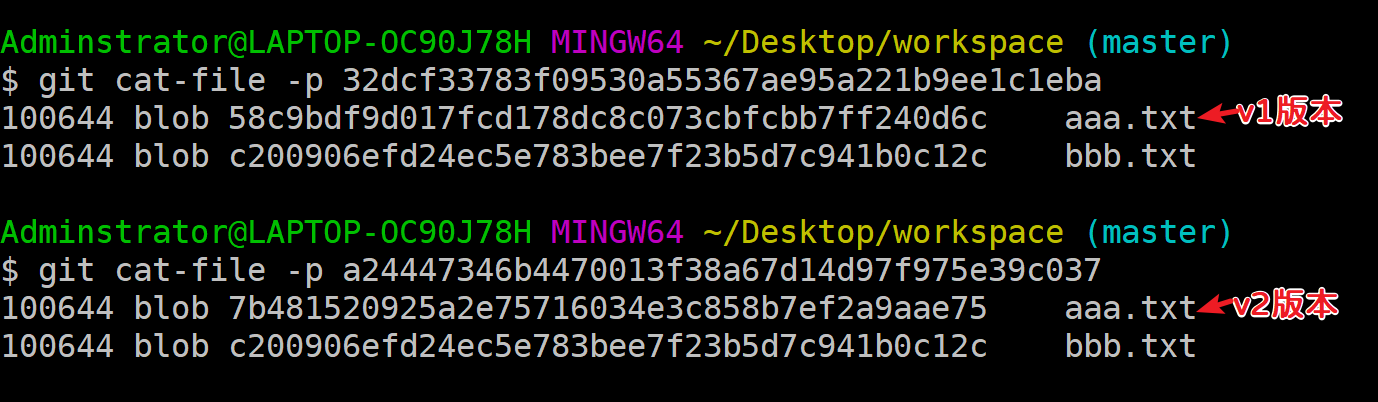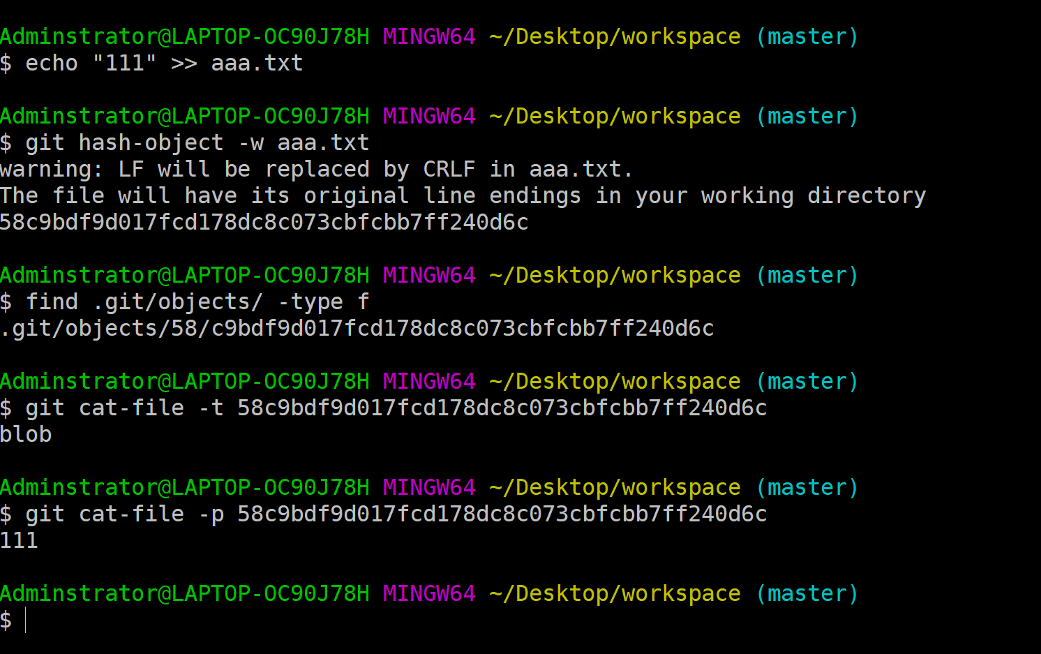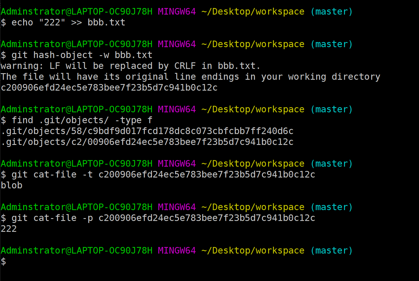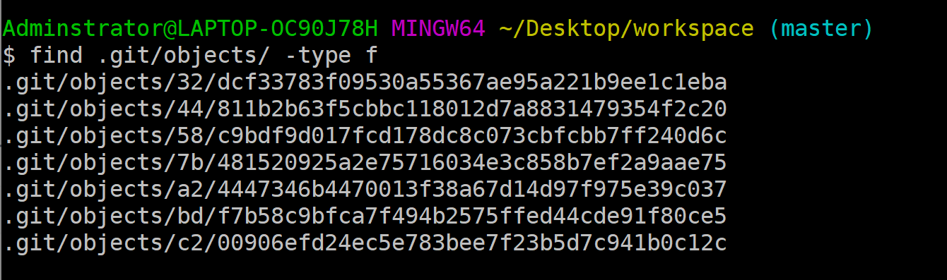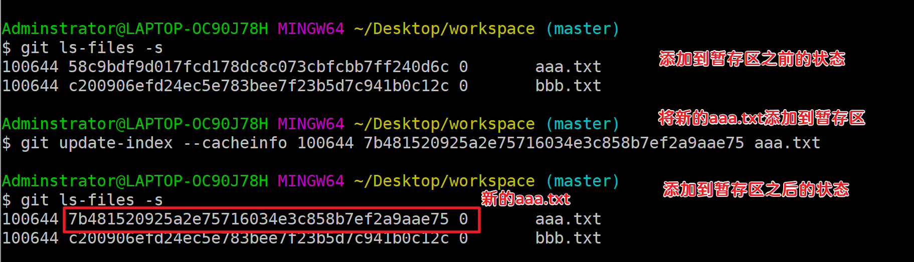 Adminstrator@LAPTOP-OC90J78H MINGW64 ~/Desktop/workspace (master)# 查看暂存区(生成提交对象不会对暂存区有影响)