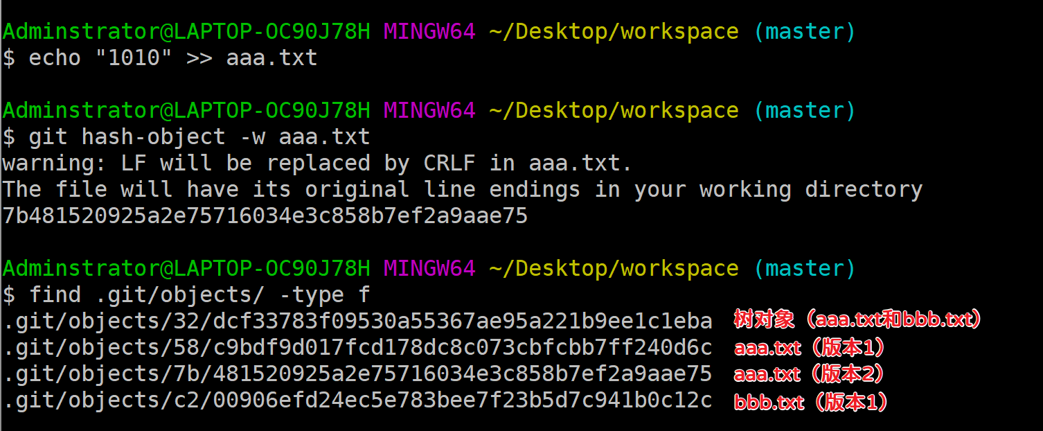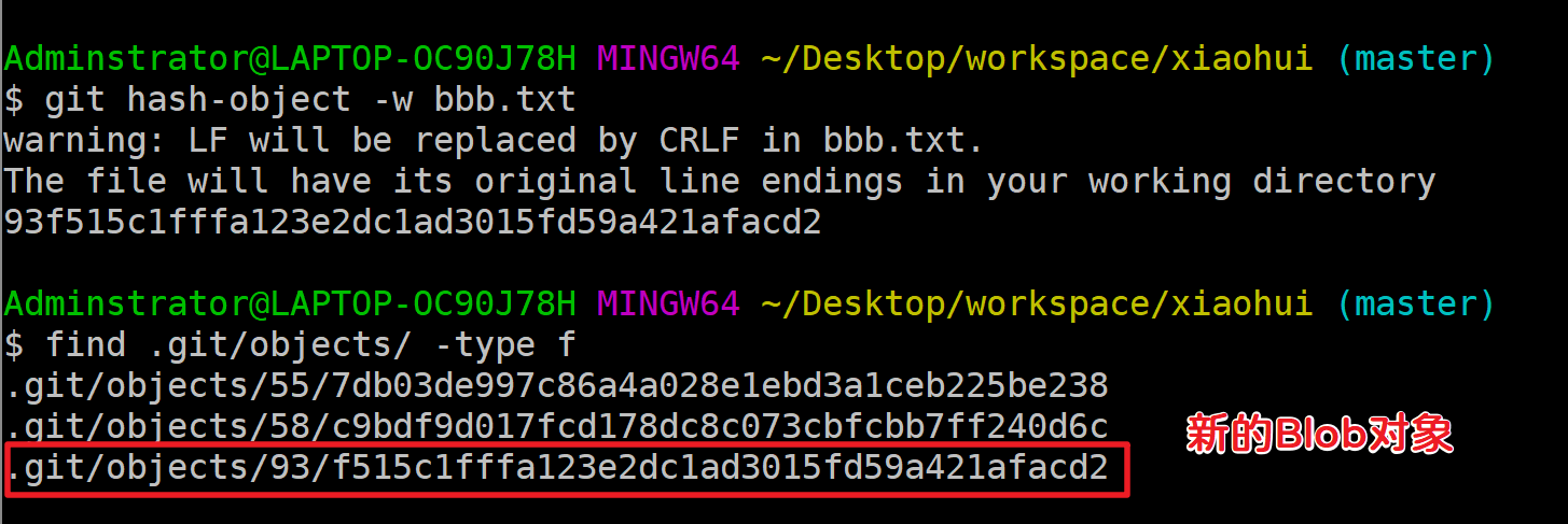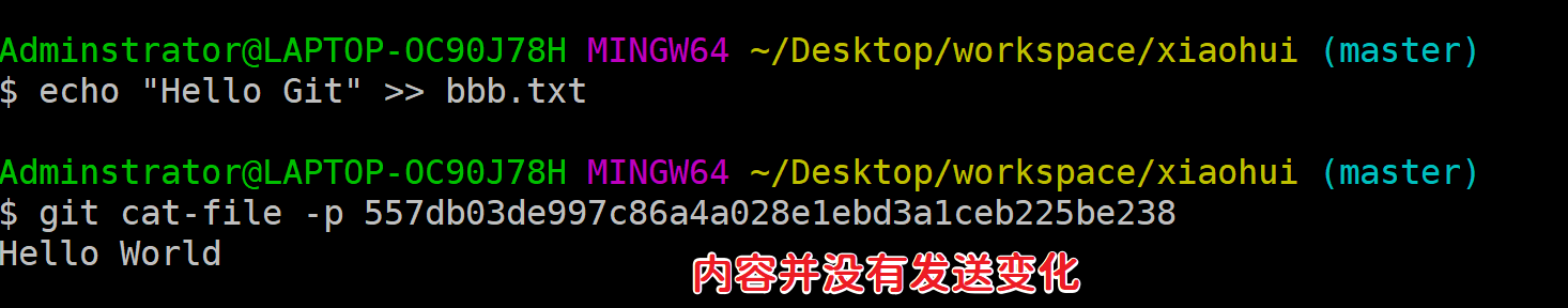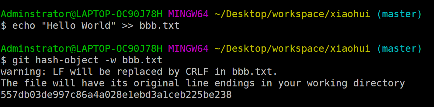 echo"Hello World">> bbb.txt # 创建一个新的文件git hash-object -w bbb.txt # 写入到Git中