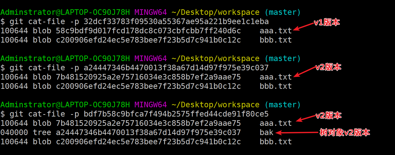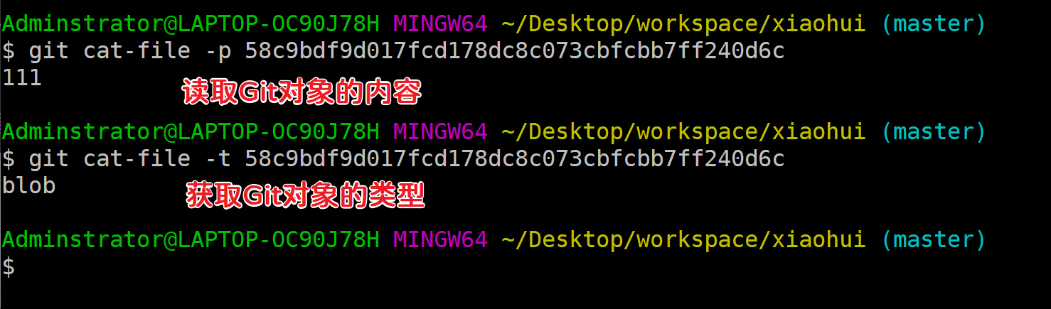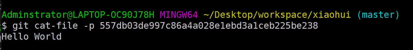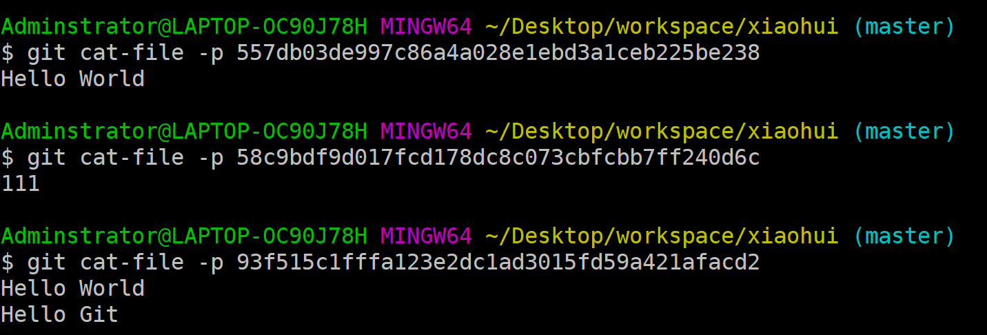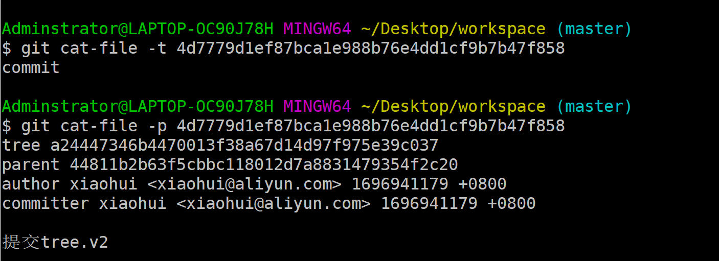 Adminstrator@LAPTOP-OC90J78H MINGW64 ~/Desktop/workspace (master)# 查看该hash的内容