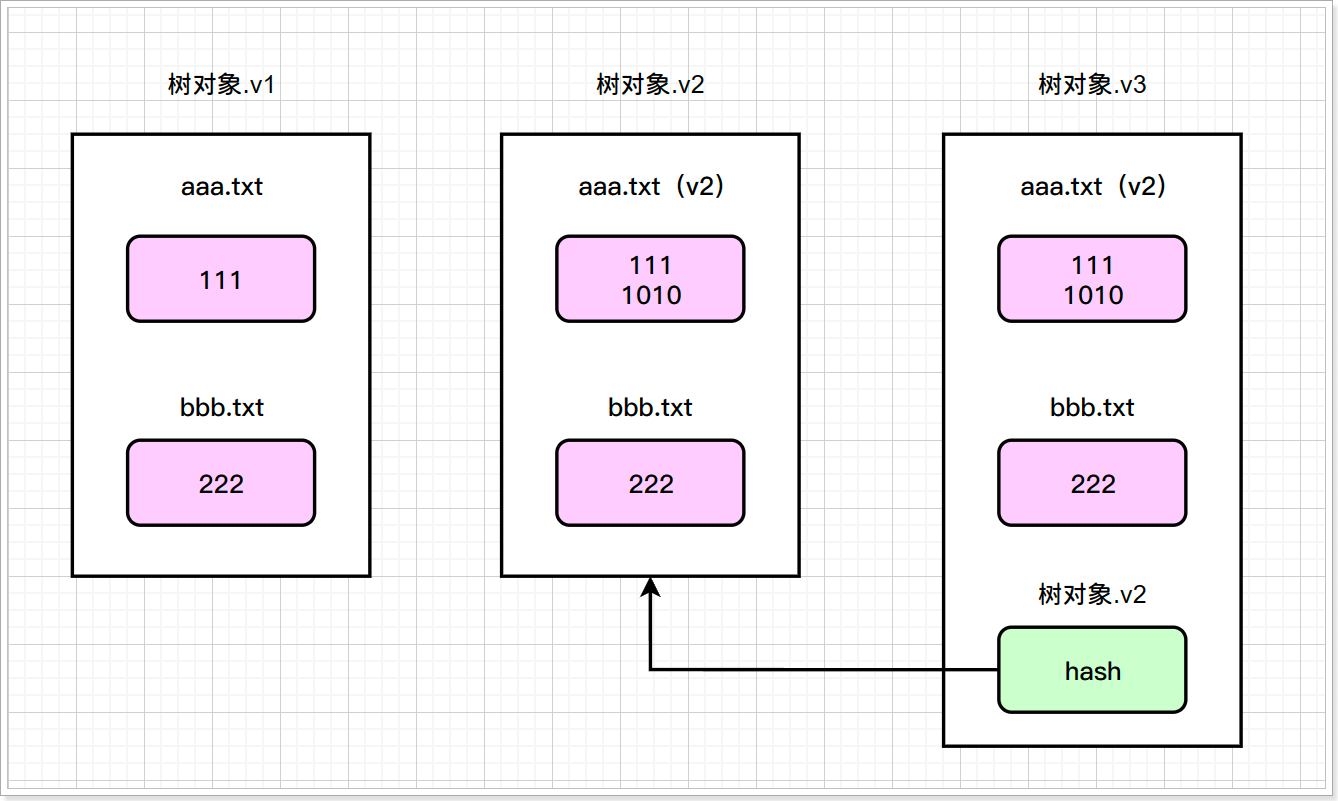 此时树对象(v3)包含一个树对象(v2)和两个Blob对象;