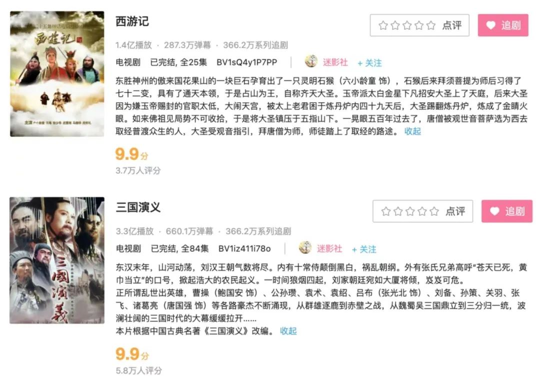 与此同时,视频网站的弹幕功能也为考古追剧的观众们带来了新鲜感。在B站等弹幕视频网站,类似《西游记》《三国演义》《红楼梦》这样的经典影视剧,由于剧集上线时间长,积累了不同时期的用户留下的弹幕内容,每一集的弹幕数量都达到了12000条。