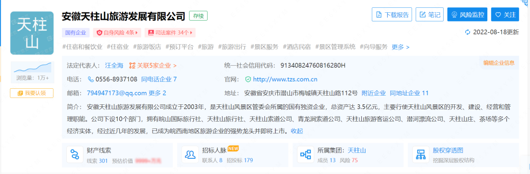 另据企查查显示,成立于2003年,以景区开发、景区基础设施建设及维护为主营业务的安徽天柱山旅游发展有限公司也有上市计划。公开资料显示,天柱山文旅是天柱山风景区管委会所属的国有独资企业,总资产达 3.5亿元,主要行使天柱山风景区的开发、建设、经营和管理职能。