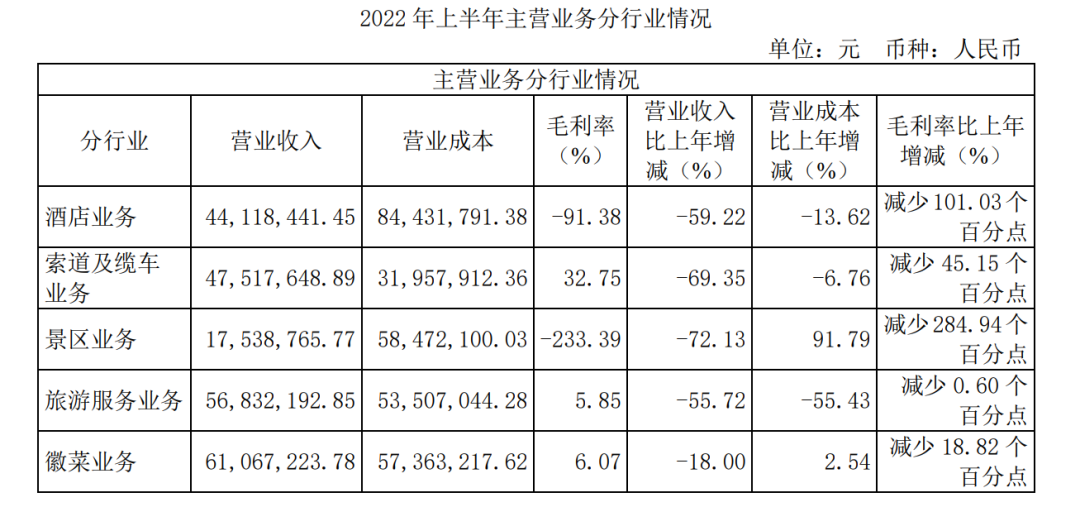 黄山旅游在疫情冲击下业务持续承压,上半年实现营业收入2.14亿元,同比减少53.53%,净利润亏损1.72亿元,同比减少599.11%。营收净利双线下滑的主要原因与疫情有着直接关系,黄山旅游表示疫情反反复复,游客进山人数骤降,上半年景区累计接待进山游客 33.36万人,较去年同期减少64.73万人。没有游客上山,景区业务、酒店业务均受到直接影响,据其财报披露,上半年黄山旅游景区业务叠加酒店业务共计亏损了8000余万元,占据上半年亏损的一半。