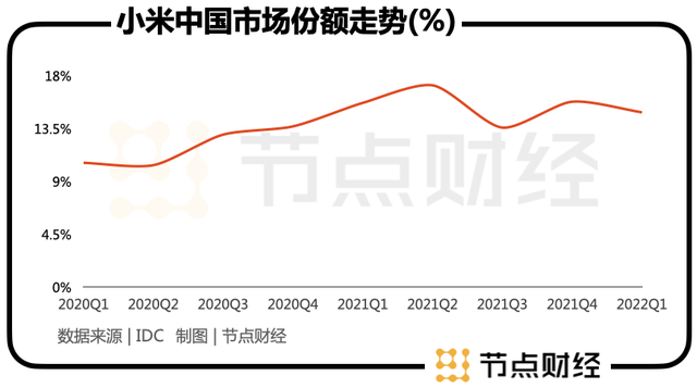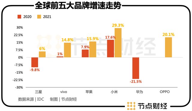 在全球市场,小米2020年和2021年的市场份额增速是前五大品牌中最快的,分别高达17.6%、29.3%。