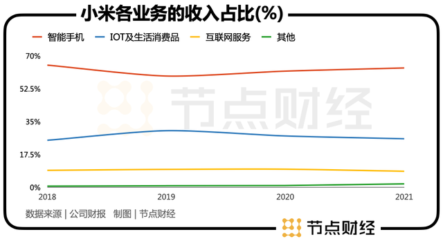 目前,小米的主要业务是手机、IoT、互联网。其中,手机业务的占比在2017年-2021年期间逐渐下降,不过仍是第一大业务,2021年占比高达63.6%。同时,也是增速最快的业务。