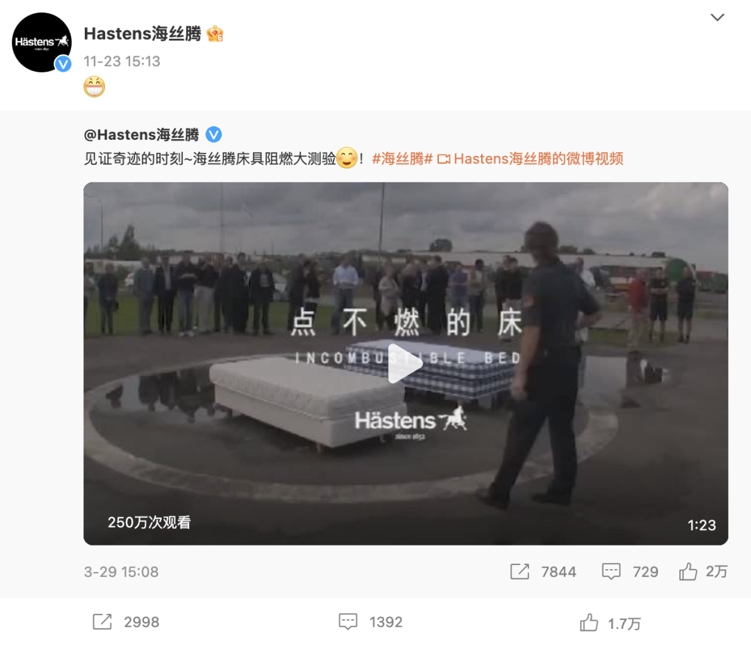 有意思的是,在大S“烧床垫”没多久,海丝腾官微就转发了此前一则“点不燃的床”广告,给网友质疑大S烧假海丝腾床垫“添油加醋”,让该品牌“赢麻了”。