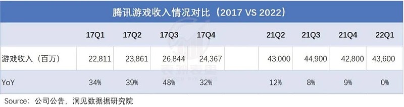 业务景气度悬殊巨大,反馈在数据上就是,2017年,腾讯游戏收入增速达38%;反观2022Q1,游戏收入增速为零。