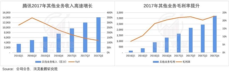 这反馈到数据上,2017年腾讯其他业务收入高速增长,同时也驱动毛利率持续提高。