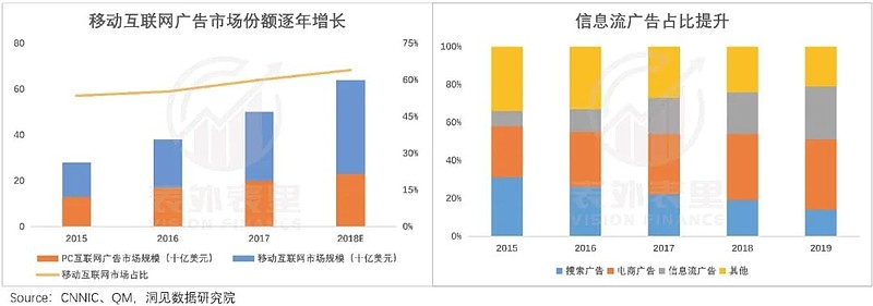 可以看到,2017年前后,正值4G网络高速渗透期,随着智能手机普及开来,广告的重心也从传统PC端向移动端转移。易观数据显示,2016年移动端广告增长就超过了PC端。