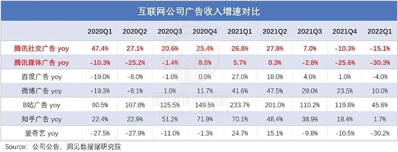 但近两年,“诚意”似乎不管用了。可以看到,2022Q1腾讯的广告业务同比负增长18%,在一众互联网企业中,基本是最差劲的。