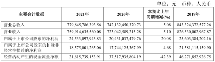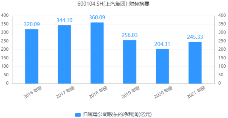 2021年年报数据显示,去年全年上汽集团实现营业总收入7798.5亿元,同比增长5.1%,归属于上市公司股东的净利润245.3亿元,同比增长20.1%。扣除非经常性损益后的净利润为185.75亿元,同比小幅增长4.68%。