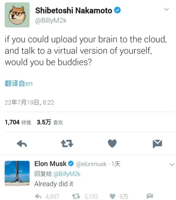 7月19日,狗狗币联合创始人比利·马库斯在推特发问:要是你能把大脑上传至云端,并且和你的虚拟版本对话,你们会成为好朋友吗?马斯克则回复称:“我已经这样做了,并已经与虚拟版本的自己交谈过。”