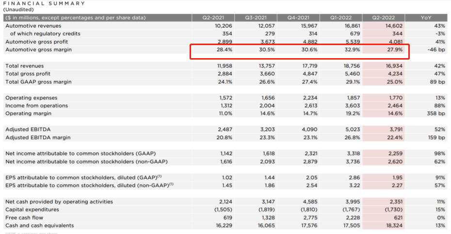 据特斯拉财报显示,二季度特斯拉汽车业务毛利率下降至27.9%,而在一季度特斯拉汽车的毛利率为32.9%,一个季度下滑5个百分点,并不正常。即便是和去年同期28.4%毛利率相比同样也是下滑不少。