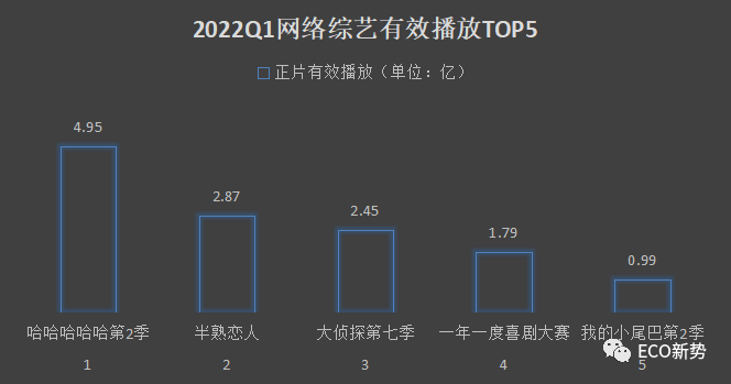 云合数据显示,2022Q1各个平台的综艺节目均表现欠佳,腾讯与爱奇艺综艺节目有效播放量约为20亿,而芒果TV与优酷约为10亿,同比缩减2至5成。