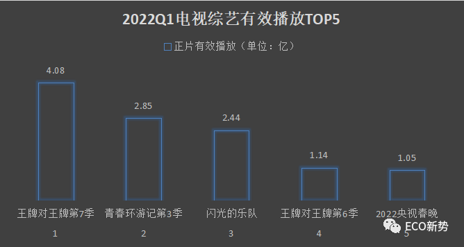 收视率是衡量一档节目制作水平和招商引资最直接的指标。云合数据显示,2022年Q1,全网综艺节目累计正片的有效播放量为59亿,同比下降33%。2022Q1夺得电视综艺有效播放榜首的是《王牌对王牌第7季》,播放量为4.08亿,对比去年同期,《王牌对王牌第6季》播放量达到11.89亿,榜首播放量缩水了近三分之二。2022Q1网络综艺有效播放榜首为《哈哈哈哈哈第2季》,播放量为4.95亿,同样低于2021年Q1有效播放榜首《青春有你第3季》的5.40亿。