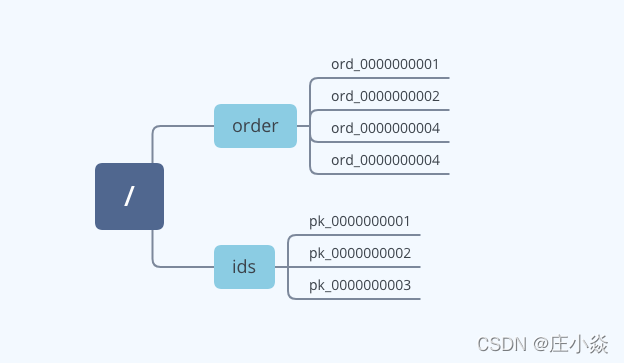 在代码层面的实现中,如上图所示。我们可以利用 ZooKeeper 数据模型中的顺序节点作为 ID 编码。客户端通过调用 create 函数创建顺序节点。服务器成功创建节点后,会响应客户端请求,把创建好的节点信息发送给客户端。客户端用数据节点名称作为 ID 编码,进行之后的本地业务操作。