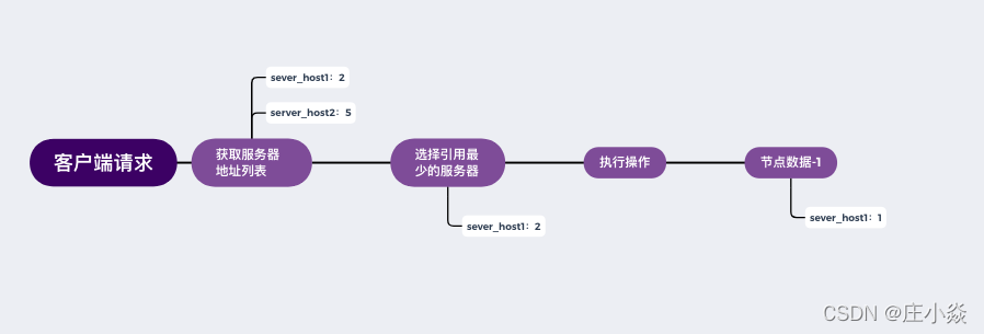 整个实现的过程如下图所示。首先,在接收到客户端的请求后,通过 getData 方法获取服务端 Severs 节点下的服务器列表,其中每个节点信息都存储有当前服务器的连接数。通过判断选择最少的连接数作为当前会话的处理服务器,并通过 setData 方法将该节点连接数加 1。最后,当客户端执行完毕,再调用 setData 方法将该节点信息减 1。