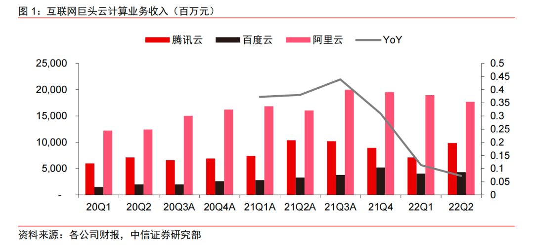 反观互联网云厂商,收入增速却出现了大幅回落的情况。以BAT三家为例,2022年二季度,三家合计收入增速不足10%。