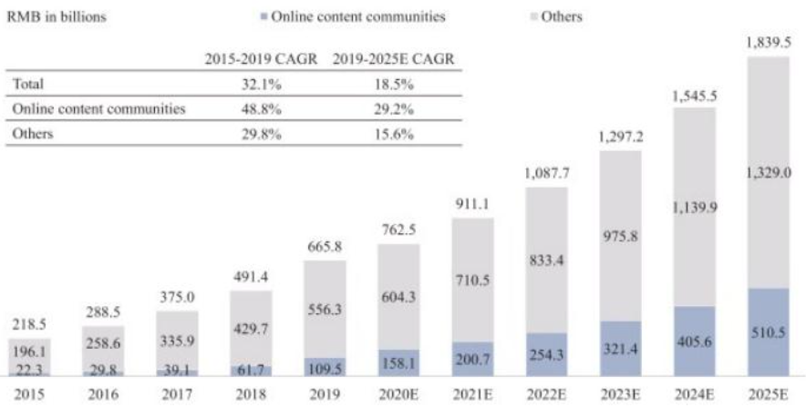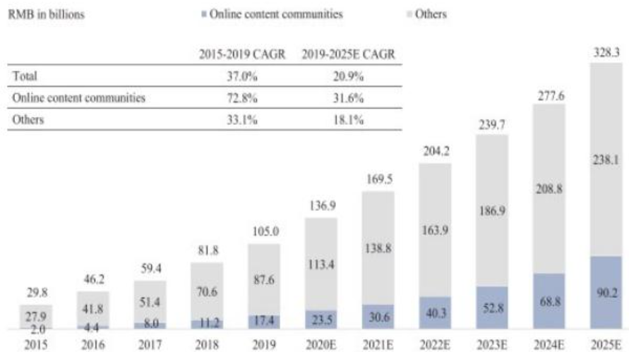 据灼识咨询(China Insights Consultancy,简称“CIC”)报告显示,按收入计,中国在线内容社区的市场规模从2015年的386亿元增至2019年的2758亿元,并预计将以复合年增长率30.3%的增速增至2025年的1.3万亿元,但仅占美国市场(约10亿元)的三分之一。此外,中国在线内容的社区用户基础也从2015年的5.162亿大幅增至2019年的7.73亿,并有望于2025年进一步增至10亿。