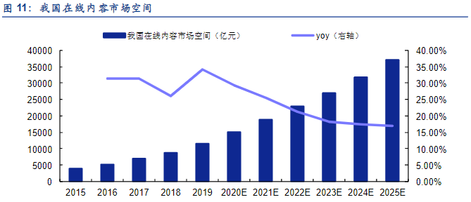 在线内容社区以不断增长和高质量的用户流量、技术实现的高营销效率以及创新的广告格式吸引广告商,使得2019年我国在线广告收入总额达到6658亿元,预计将于复合年增长率18.5%的增速增至2025年的18万亿元。其中在线内容社区的在线广告收入于2019年已达到1095亿元,并预计以复合年增长率29.2%的增速进一步增至2025年的5105亿元。