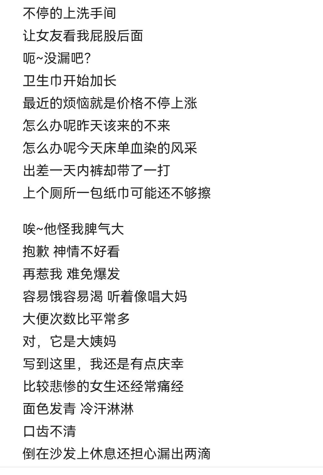 像2016年左卡乐队的《大姨妈》,是以男性创作的视角来看待月经,既有共情女性的“有时候痛的她不想在人间”,也有男性面对女性经期的不满,“我心惊胆战又度日如年”。