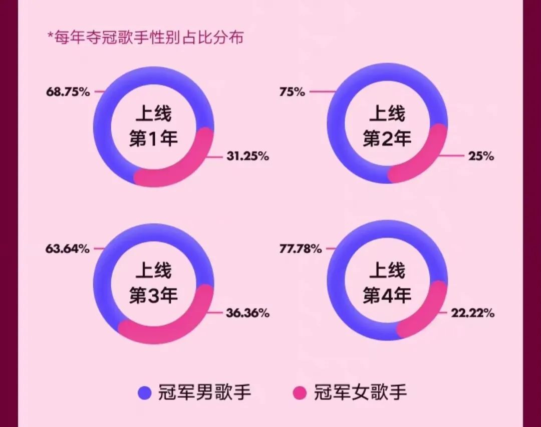 根据近期腾讯音乐由你音乐榜发布的四周年数据显示,回顾这四年来的华语乐坛变迁,女性歌手在榜单中夺冠次数占比分别为31.25%、25%、36.36%、22.22%。 总体上远远低于男性歌手,甚至经历了一定的大幅下降。