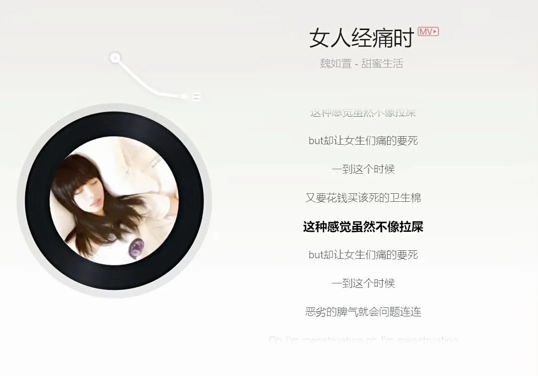 2007年,“自然卷”乐团主唱魏如萱以一首《女人经痛时》,将女性经期难以忍受的痛经现象,搞怪又犀利地摆在了大众面前。在这首歌中,更是直白写出“这种感觉虽然不像拉屎,却要让女生们痛得要死”,她还在MV中痛苦地蹲坐在马桶上,“控诉”着惨绝人寰的痛经过程。这也引发不少女性乐迷共鸣,至今仍旧拥有极高播放量,成为女性经期发泄情绪的专属歌曲。