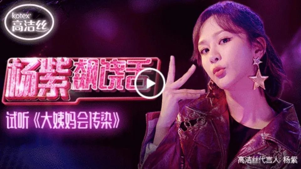 像是2017年,卫生巾品牌高洁丝联手演员杨紫推出品牌歌曲《大姨妈会传染》,以闺蜜主题切入,歌词也以“姨妈都在同一天就是这么巧”、“大姨妈会传染,我的世界全都有你”等,来表达“月经”是闺蜜之间的默契内容。