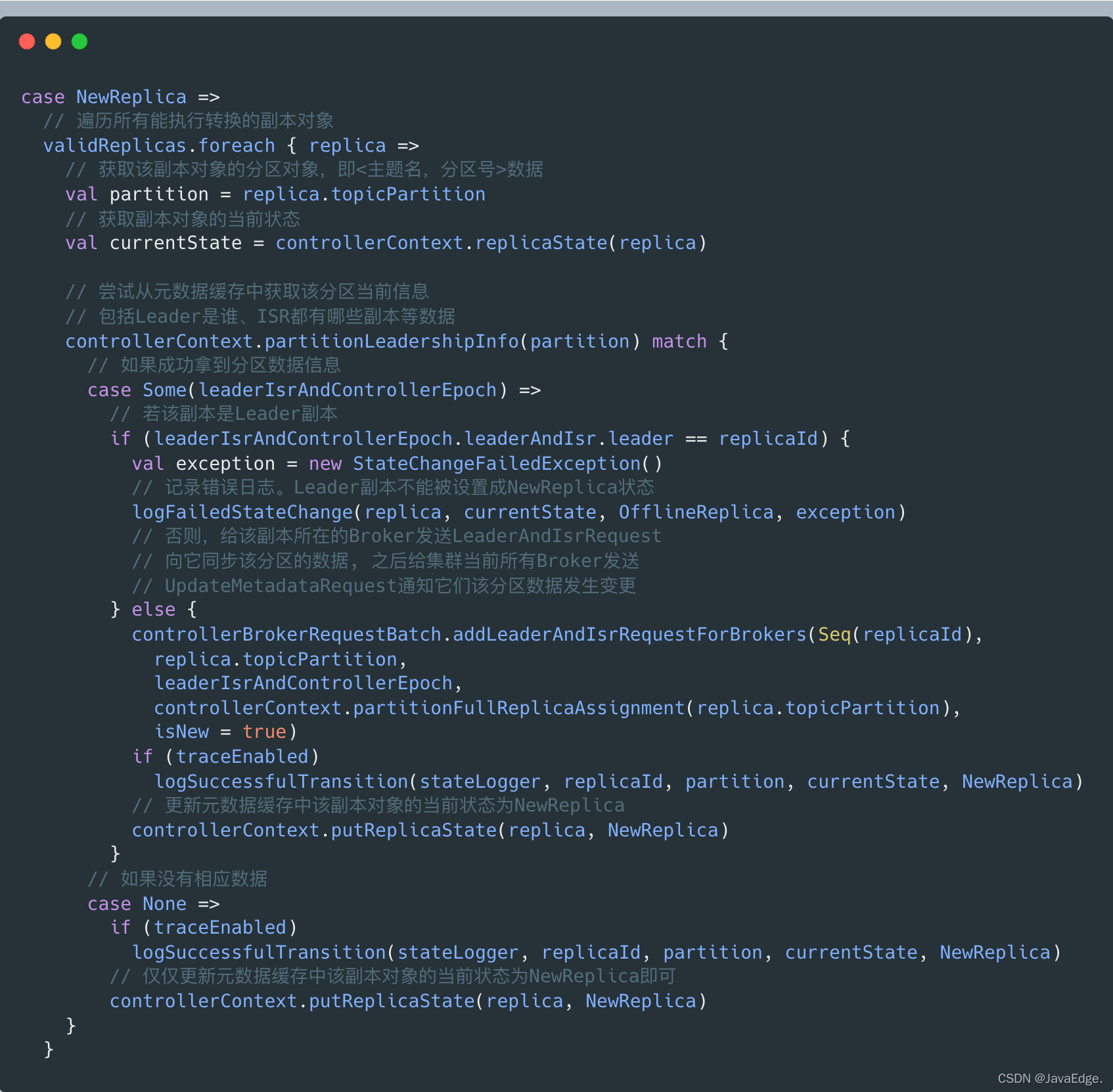 - 代码携带能执行合法转换的副本对象集合,进入不同代码分支。当前Kafka为副本定义7类状态,因此,共有7条分支