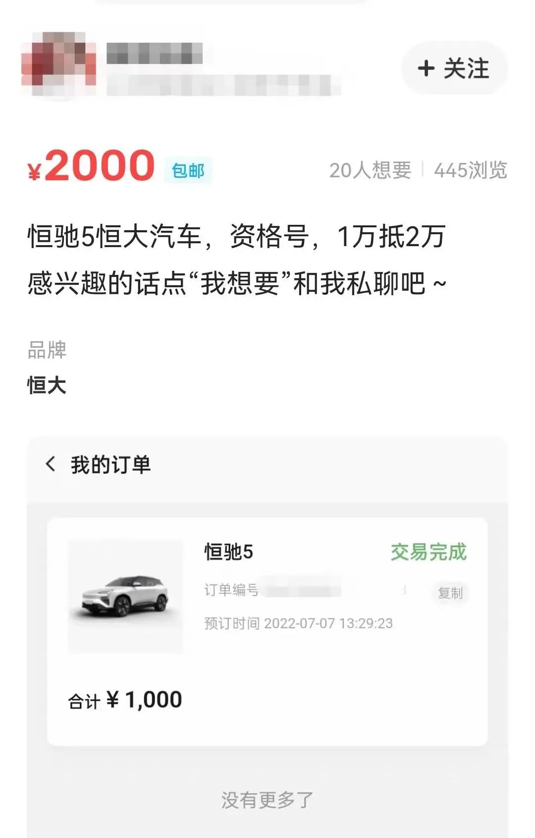 时代财经发现,在某二手交易平台上,已出现多个炒卖恒驰5前一万名名额的帖子。其中,一位卖家拟以2000元转让恒驰5资格号,另一位卖家则称“多订了1辆”,拟以5000元转让购车资格,“1万抵2万”是他们的卖点。从发布的订单信息看,上述卖家均为付款1000元的“小订”客户。