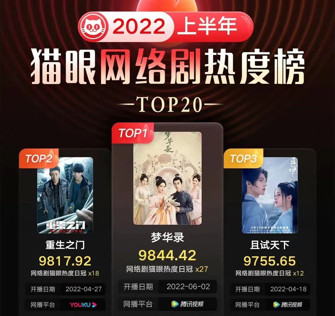 在这种环境下,剧集市场上半年仍然出现了《人世间》《开端》《重生之门》《梦华录》等影响力出圈的作品,而这也为观察长视频内容和市场提供了视角。近期灯塔专业版发布了《2022上半年剧集市场观察》,猫眼专业版也有相应的榜单,都提供了更多观察依据。