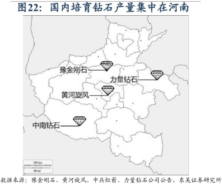目前,80%的“中国制造”培育钻石来自河南。产业头部公司中南钻石(中兵红箭子公司)、黄河旋风、豫金刚石(已退市)和力量钻石也均位于该省。