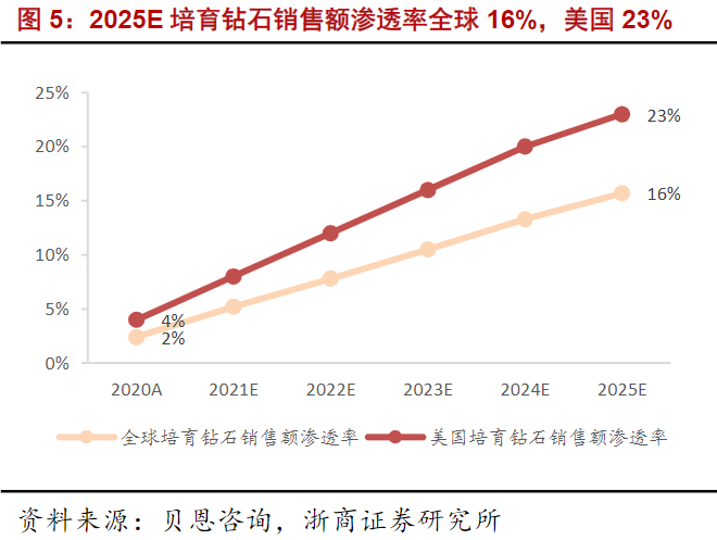 目前全球培育钻石销售额渗透率仅有5%,贝恩咨询预计这一数字在2025年会达到16%。券商测算,中国产培育钻石原石2022-2025年需求满足率从68%提升至85%,行业总体供不应求。未来几年,已经成熟的河南培育钻石产业群,仍将对世界培育钻石市场价格有举足轻重的影响。
