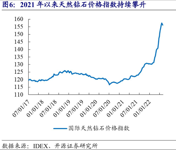 2022年以来,印度培育钻石毛坯累计进口额同比增长了72%,成品出口额增长了81%,6月珠宝零售市场淡季,这一进口额/出口额同比增长速度仍达到了47%/57%。印度是培育钻石中游切割打磨的主要加工地,其进出口数据较为客观地反映了全球的产业景气度2022年持续向上。