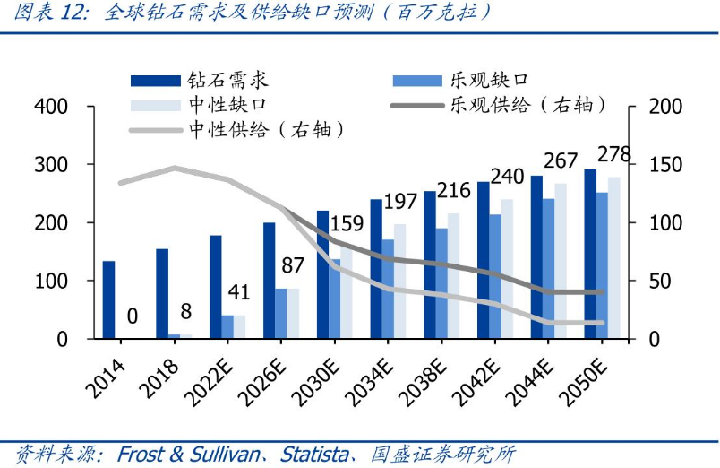 从世界钻石预计供需缺口来看,培育钻石未来市场空间较大。