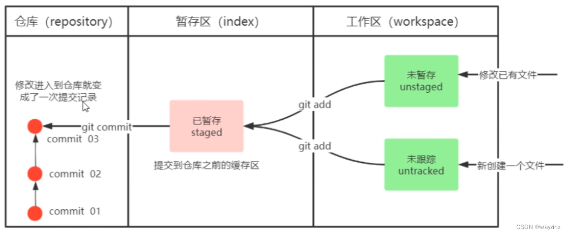 Git工作目录下对于文件的修改(增加、删除、更新)会存在几个状态,这些修改的状态会随着我们执行Git 的命令而发生变化。