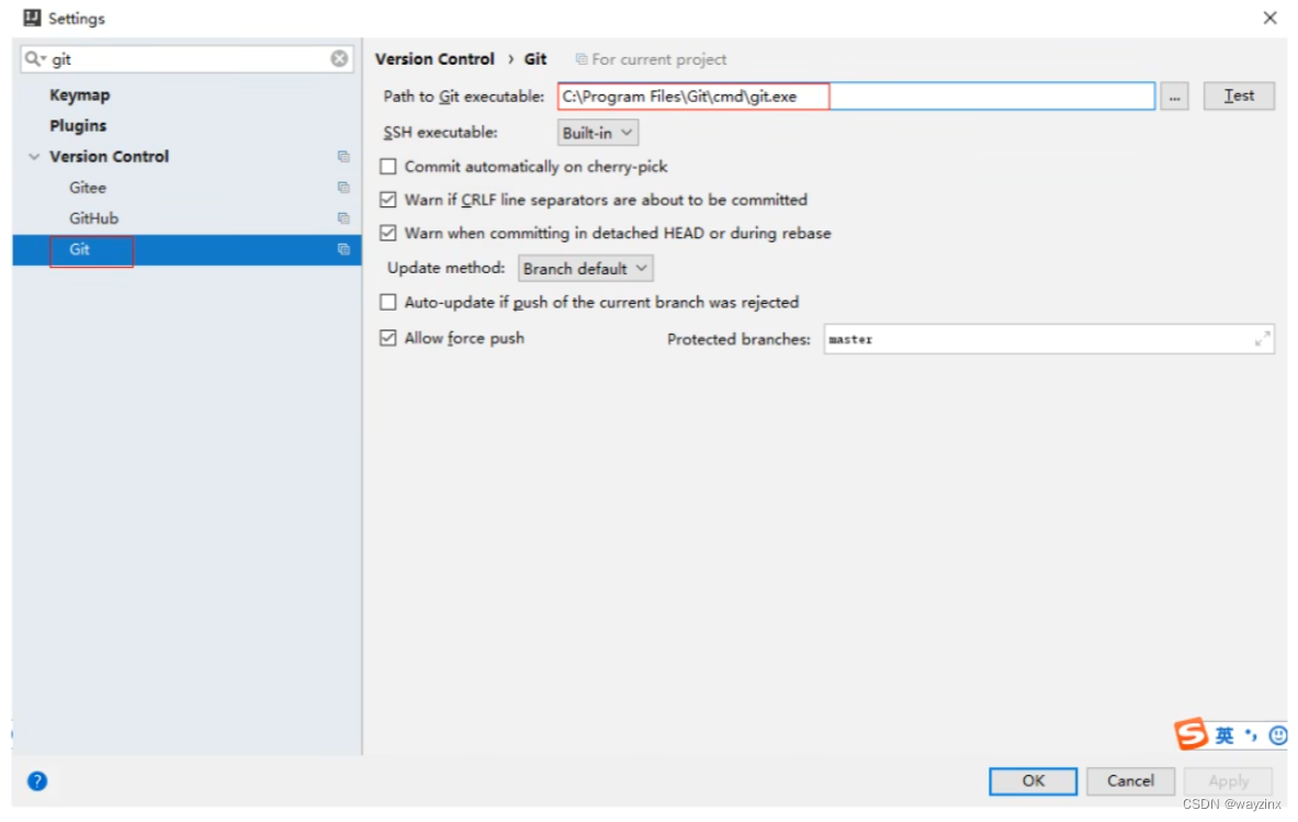 安装好idea后,如果Git安装在默认路径下,那么idea会自动找到git的位置,如果更改了Git的安装位置则需要手动配置下Git的路径。选择File-->Settings打开设置窗口,找到Version controle下的git选项: