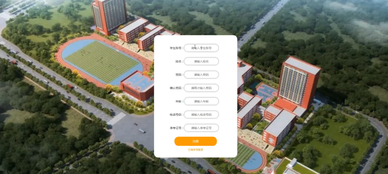 学生注册;在注册页面通过填写学生账号、姓名、密码、确认密码、年龄、电话号码、准考证号等信息完成学生注册操作,如图5-4所示。