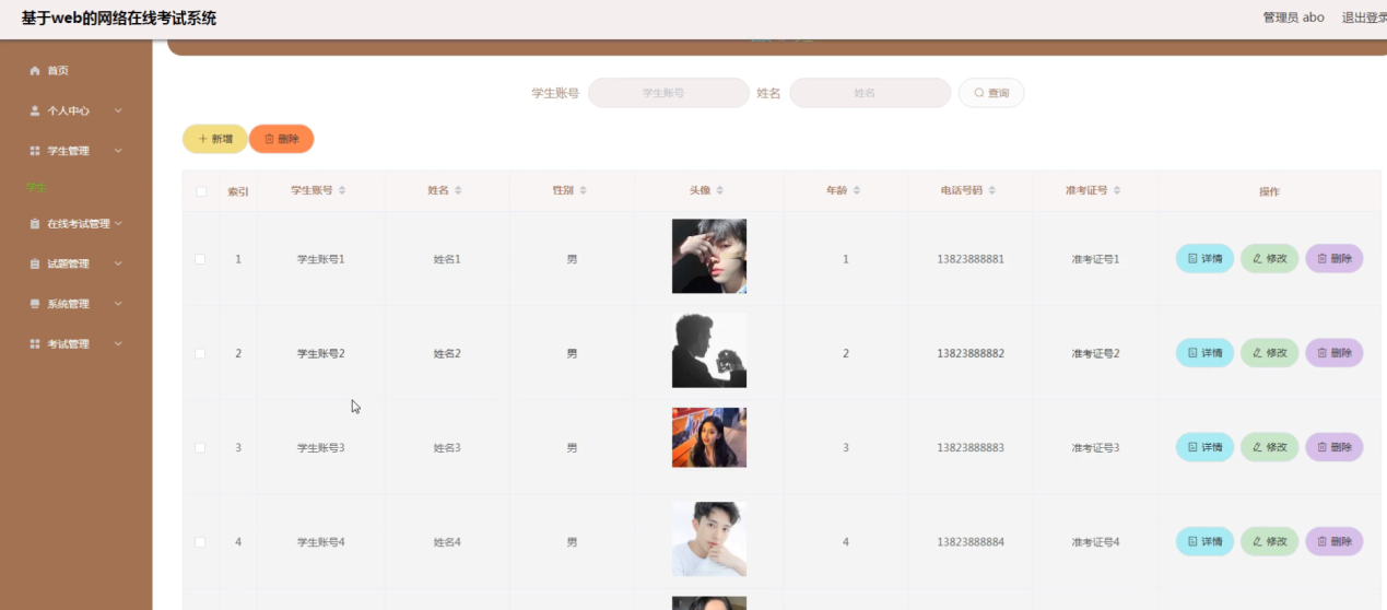 学生管理,在学生管理页面可以对索引、学生账号、姓名、性别、头像、年龄、电话号码、准考证号等内容进行详情,修改或删除等操作,如图5-8所示。