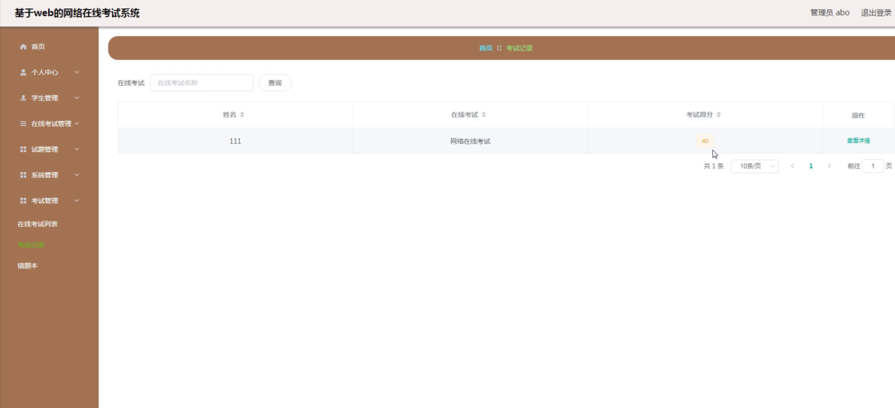 考试管理,在考试记录页面可以对姓名、在线考试、考试得分等内容进行查看详情操作,还可对在线考试列表、错题本进行详细操作,如图5-12所示。