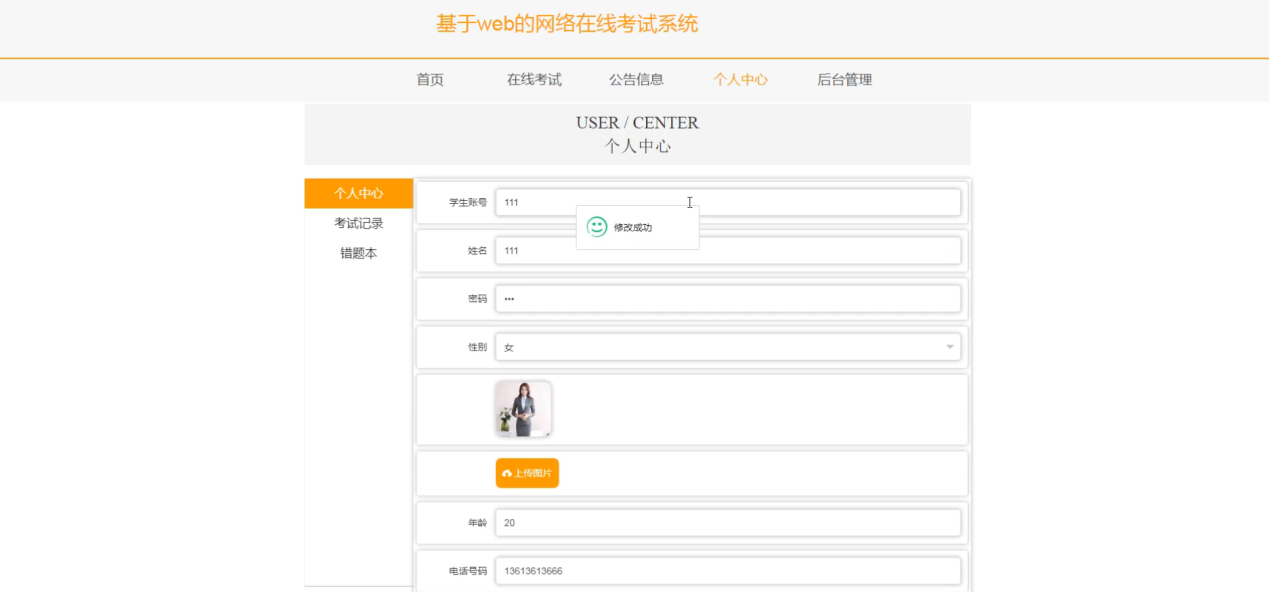 个人中心,在个人中心页面通过填写学生账号、姓名、密码、性别、上传图片、年龄、电话号码、准考证号等信息进行更新操作,还可以对考试记录、错题本进行相应操作,如图5-6所示。