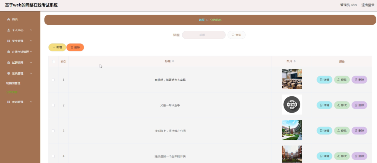 系统管理,在公告信息页面可以对索引、标题、图片等内容进行详情,修改或删除等操作,还可对轮播图管理进行详细操作,如图5-11所示。