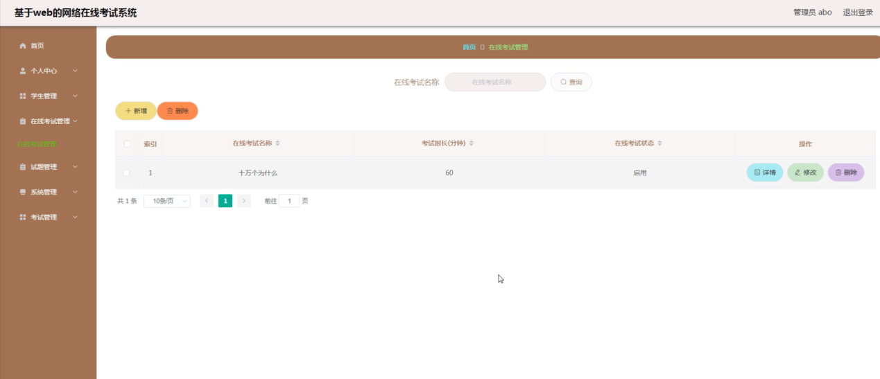 在线考试管理,在在线考试管理页面可以对索引、在线考试名称、考试时长(分钟)、在线考试状态等内容进行详情,修改或删除等操作,如图5-9所示。