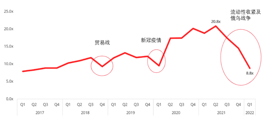 据悉,目前海外已上市的SaaS公司的市值下降了近40%-50%,因此市场不得不重新评估这些企业的价值倍数。这对于部分即将IPO的独角兽企业将是一场悲剧。去年同类型的初创公司估值高达35x至100x,但今年甚至很难达到10x。
